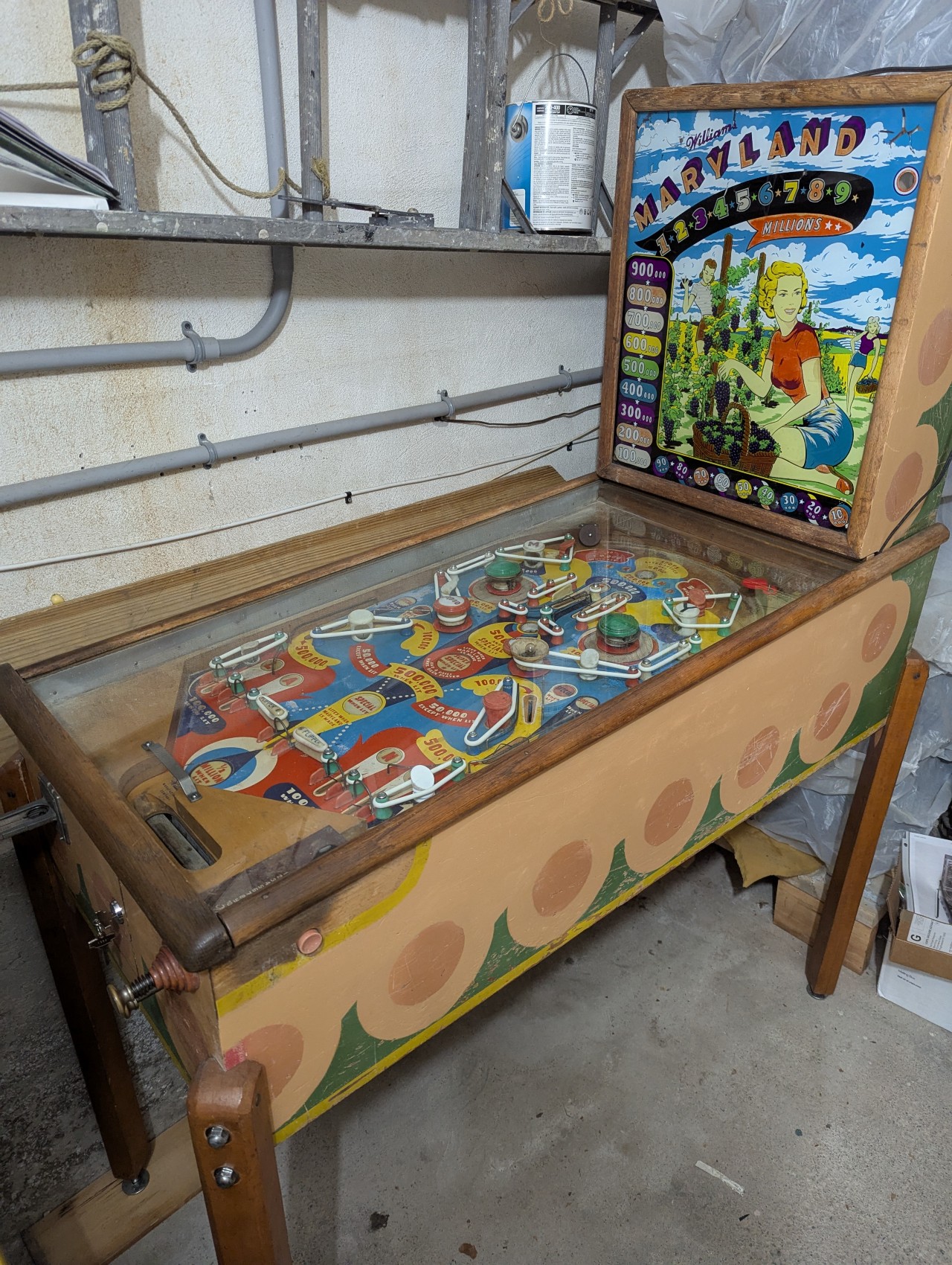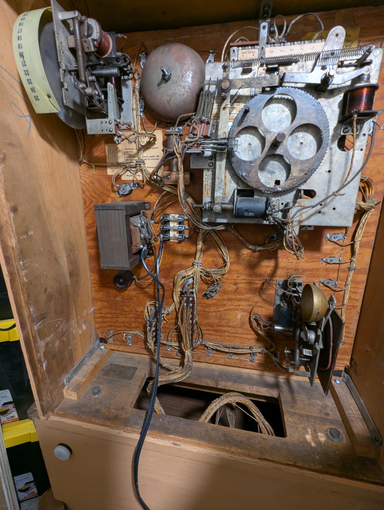 The table is in fair shape (it is 76 years old, at this point), and the seller had replaced the rubber bumpers and the playfield glass before passing it on to me for relatively cheap. I'll try and document the table here, and my progress in getting it playable.