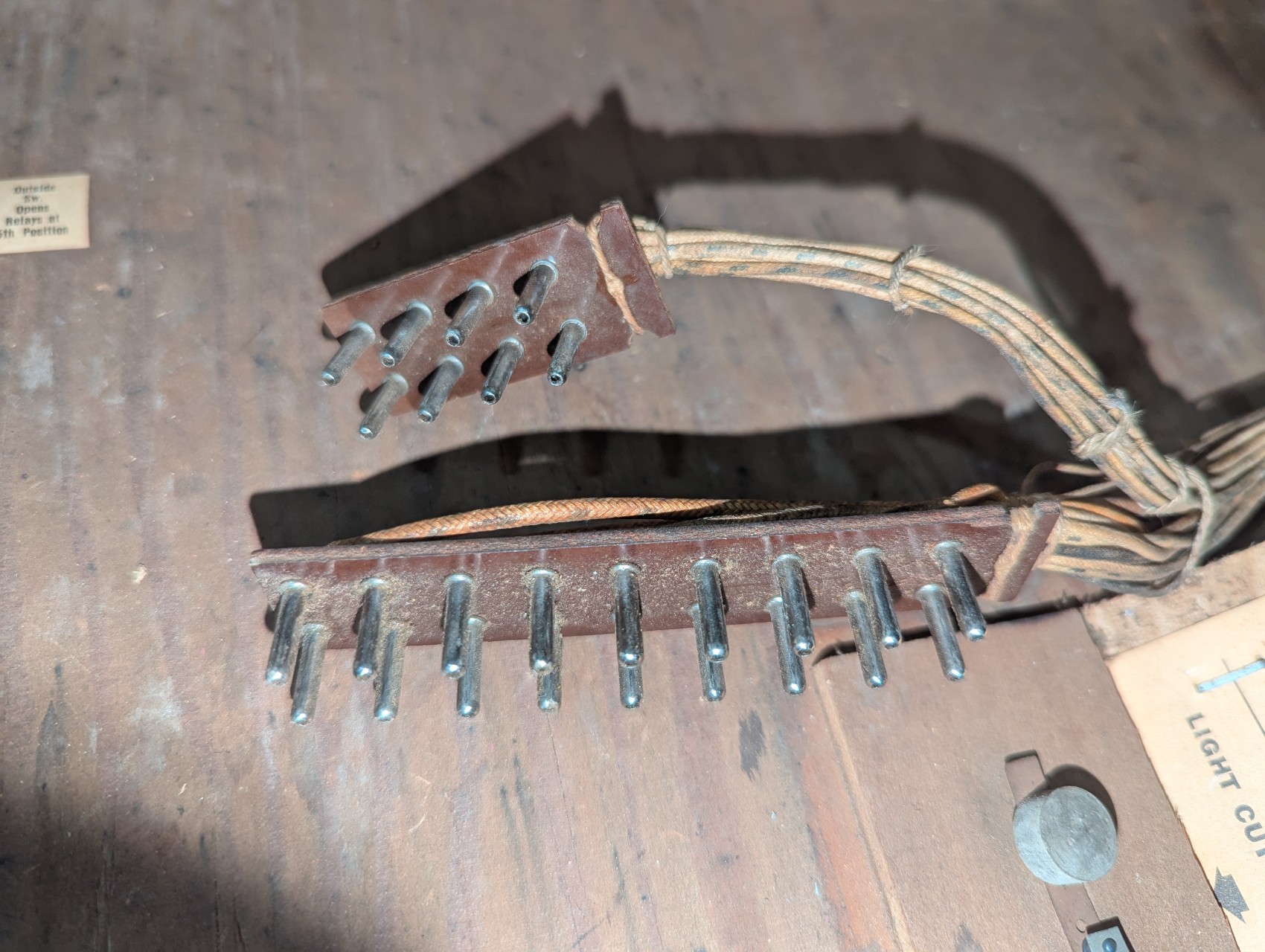 These are the wire harness connectors for the wires that run up from the playfield, into the backbox, and connect there so that power can make it down to all of the lights and flippers and bumpers. I'd disconnected the Jones plugs on the day I bought the table, in order to separate the backbox from the playfield so that everything could fit into my car. I'd forgotten to reconnect them.