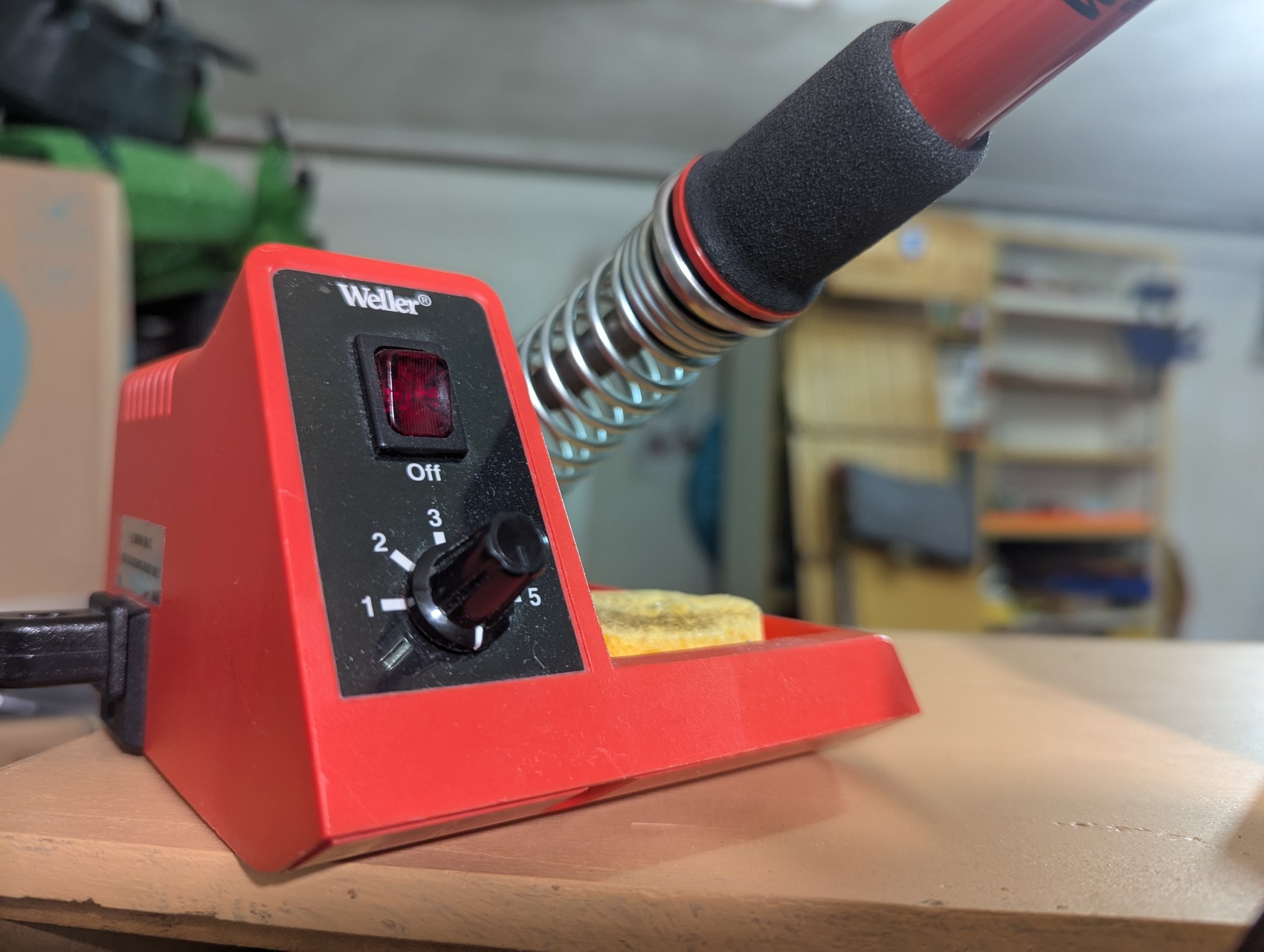 I moved my first soldering iron (a 40 watt Weller station, bought 20 years or so ago) out to the garage permanently for this project. It isn't fancy (no temperature indicator, even!), but I know it works and I know how to use it. The good soldering station and Pinecil can stay inside.